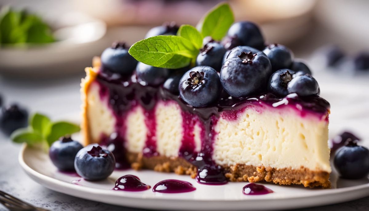 This image shows a macro food photography shot of a blueberry cheesecake. The dessert is topped with fresh blueberries and features a golden crust, set against a soft, blurred background in warm, natural light.