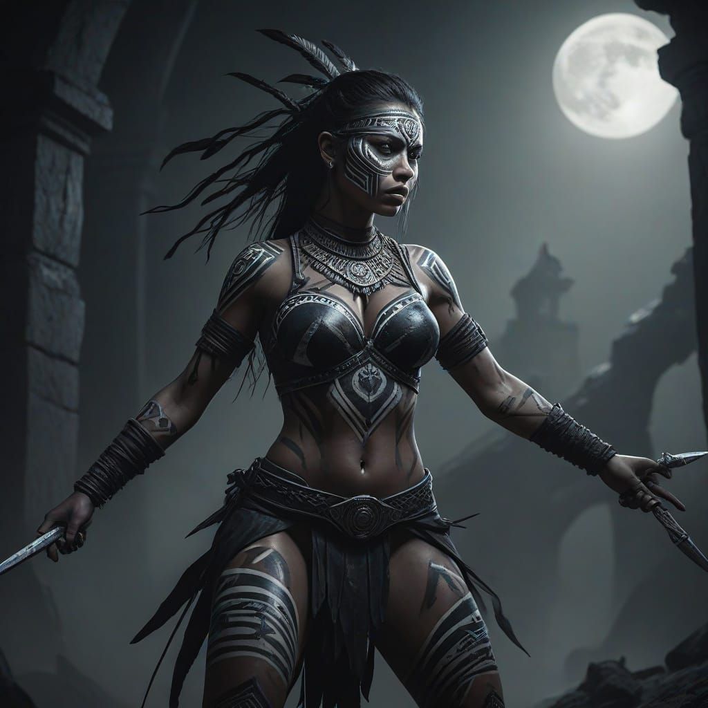 This image shows a powerful amazon warrior fighting spectral entities in a desolate ruin. The artwork features a dark, Gothic style with dramatic contrasts and sharp lines.