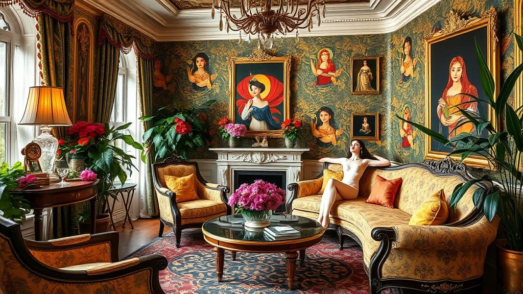 This opulent room features a tasteful blend of Art Nouveau patterns, Fauvist colors, and elegant female sculptures, surrounded by exquisite artwork and sophisticated decor, creating a luxurious atmosphere reminiscent of Gustav Klimt's and Alphonse Mucha's masterpieces.