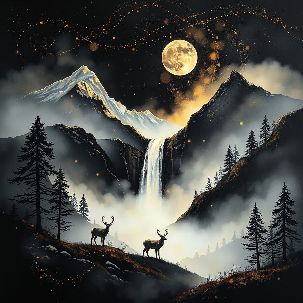 A captivating image of misty mountains, waterfalls, and deer in an ethereal landscape. The artwork features a polished gold, ink, and watercolor aesthetic on a black canvas.
