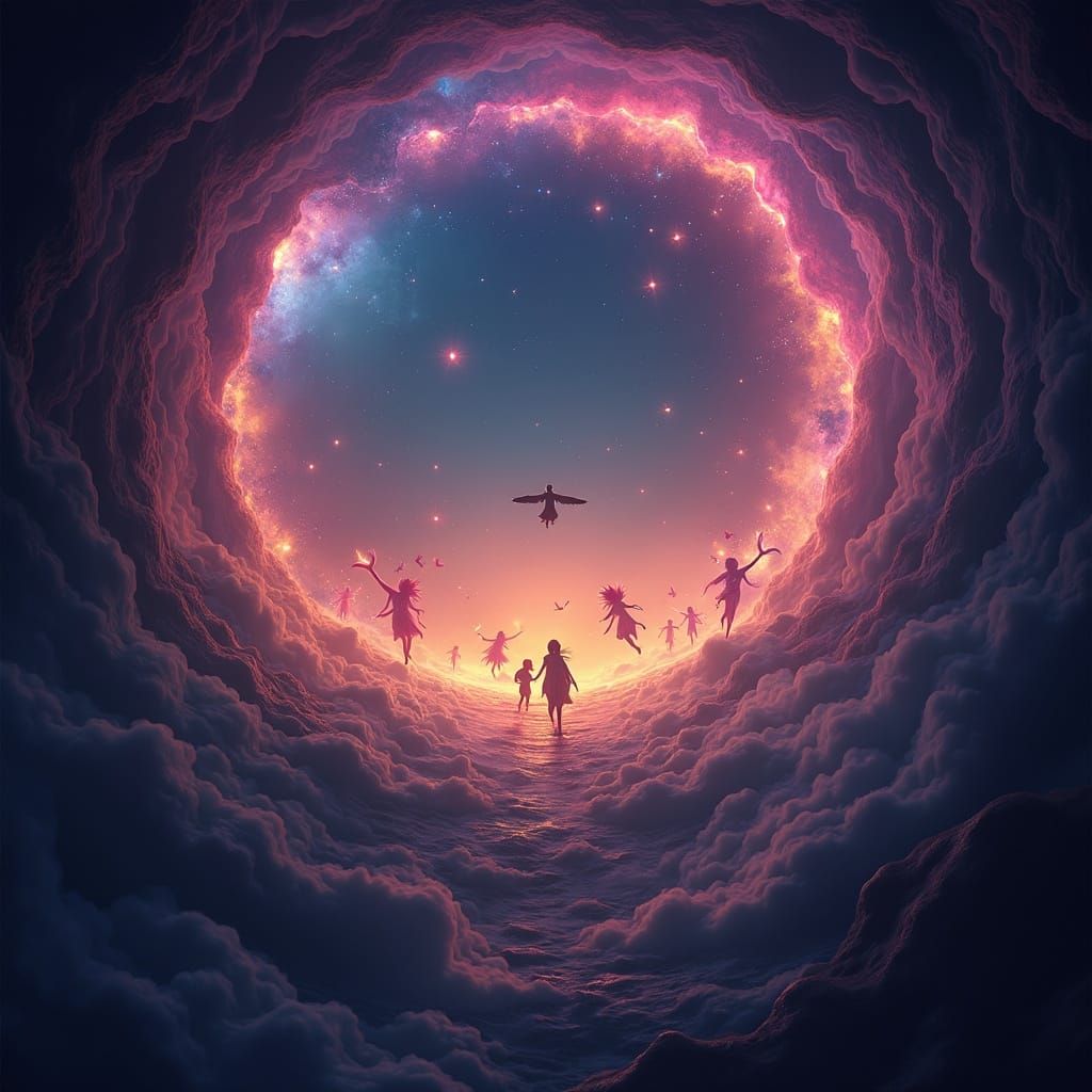 This image shows vibrant, ethereal spirits dancing joyfully above a black hole's event horizon. Rendered in a detailed matte painting style with complementary colors and fantasy concept art.