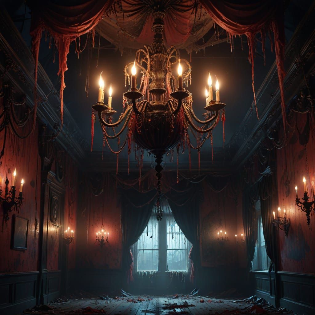This image showcases a macabre scene of creepy decorations for a zombie prom hall, featuring a decaying chandelier, cobweb-draped garlands, and eerie, phosphorescent lighting in a dark fantasy aesthetic.