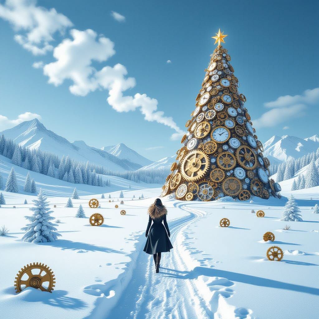 This image depicts a surreal winter scene with snow made of gears. A woman walks through the mechanical landscape towards a giant, rotating Christmas tree constructed from brass and copper clockwork, rendered with photorealistic detail.