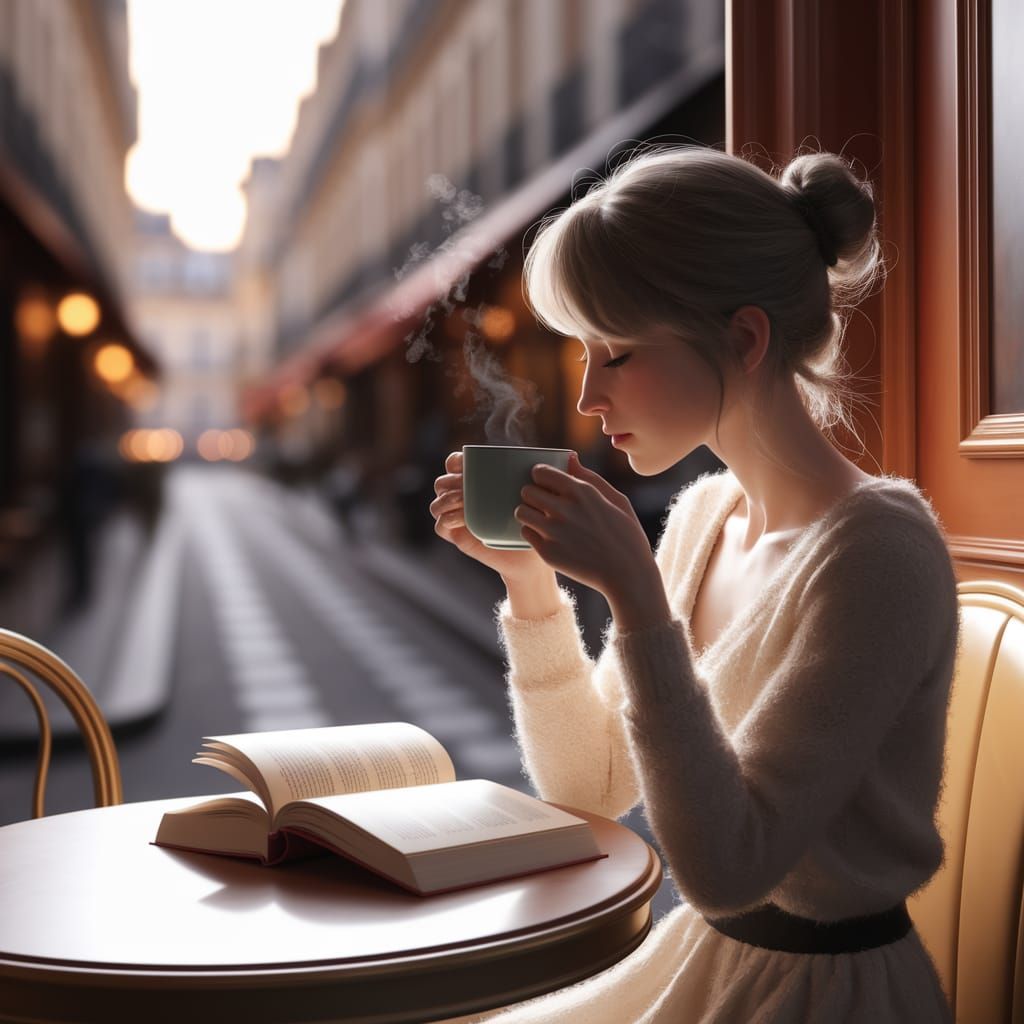 This digital art captures a sunlit Parisian cafe corner with a woman contemplating over coffee and a book. Rendered in a gentle impressionistic style with soft light and detail.