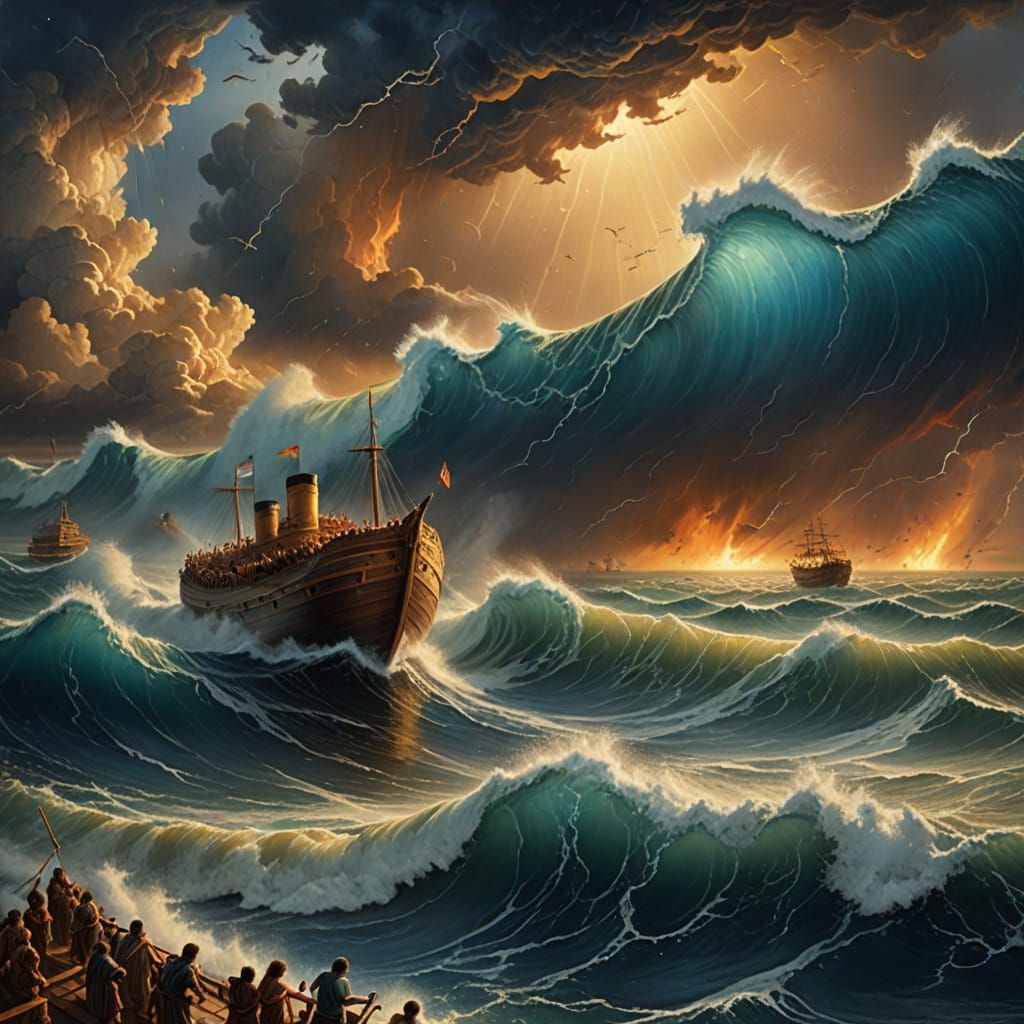 A dramatic and visually seamless painting that unites two ancient sea-related miracles into one epic scene. On the left, show Noah’s Ark enduring a violent storm — massive crashing waves, dark swirling clouds, and streaks of lightning illuminating the chaos. The sturdy wooden Ark rides the storm, symbolizing ...