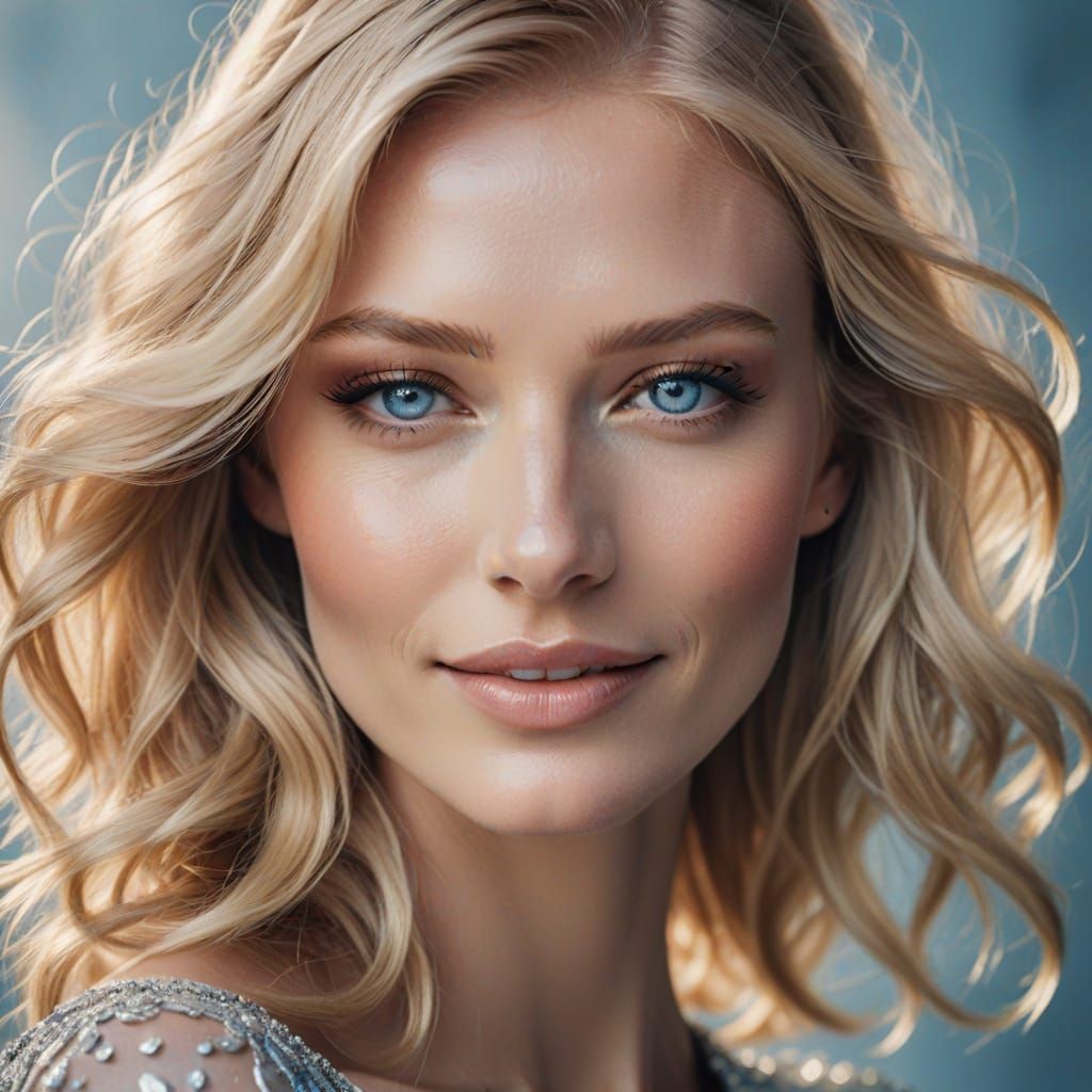 This image captures a captivating close-up of a stunning blonde supermodel in a lavish, dreamlike atmosphere. Soft, ethereal lighting and gentle textures evoke a sense of airiness and elegance, while a pastel color palette adds to the whimsical feel.