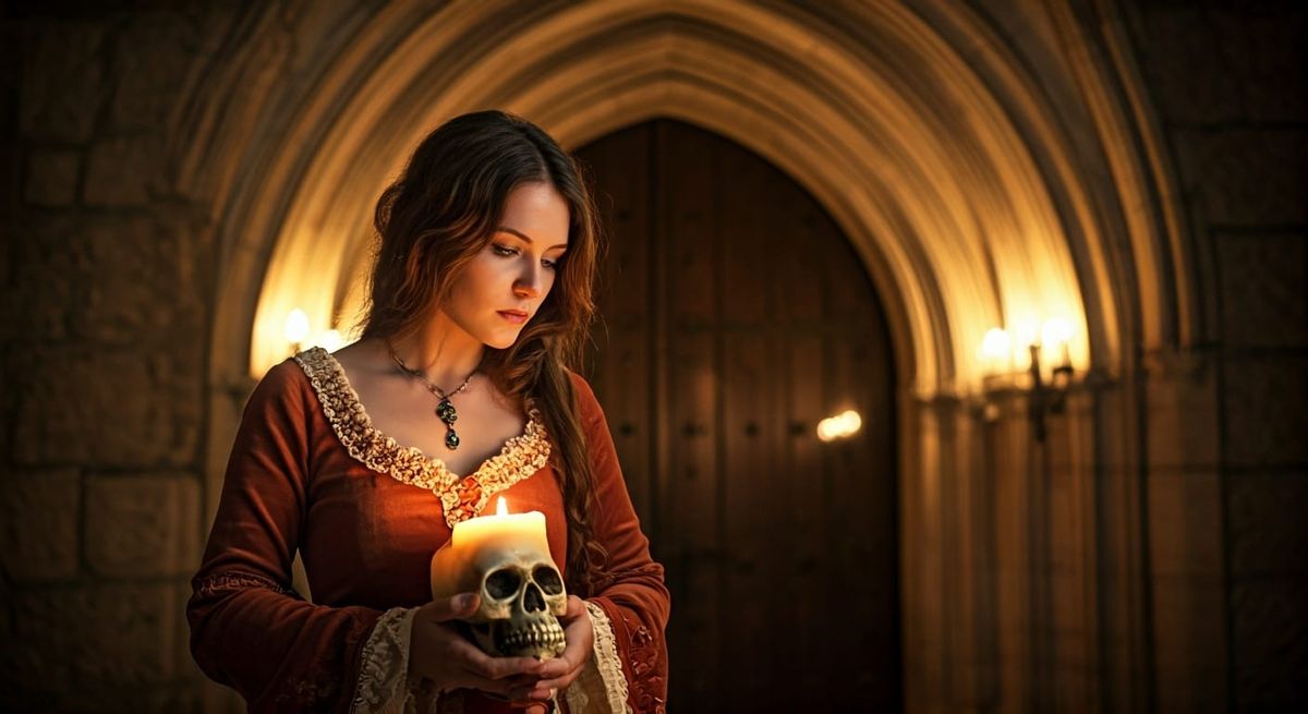 A photo of a woman in medieval dress holding a skull candle and looking down thoughtfully. Soft, diffused lighting and candle shadows illuminate the scene, reminiscent of gothic photography.