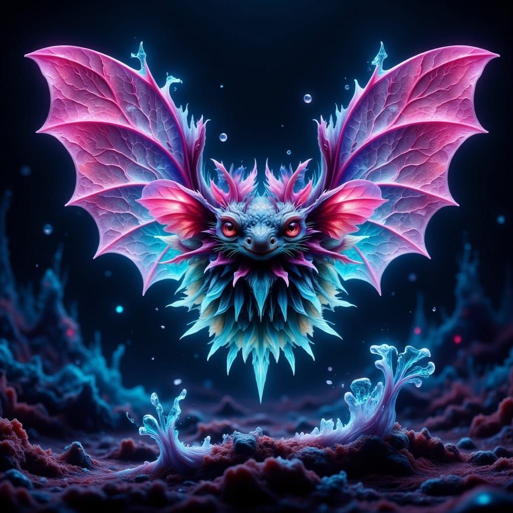 This image shows a fantastical creature with neon pink skin and shimmering webbed wings, gliding through a bioluminescent underground lake with glowing fungal caverns in the background.