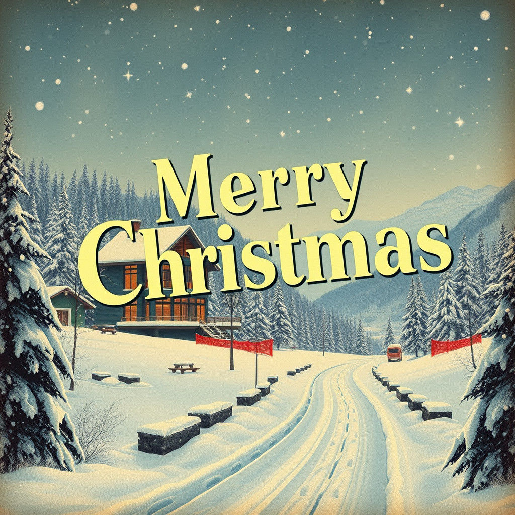 A vintage Christmas postcard featuring a snowy landscape. The card, wishing 'Merry Christmas', is designed in a mid-century modern style, evoking a sense of nostalgia and festive cheer.