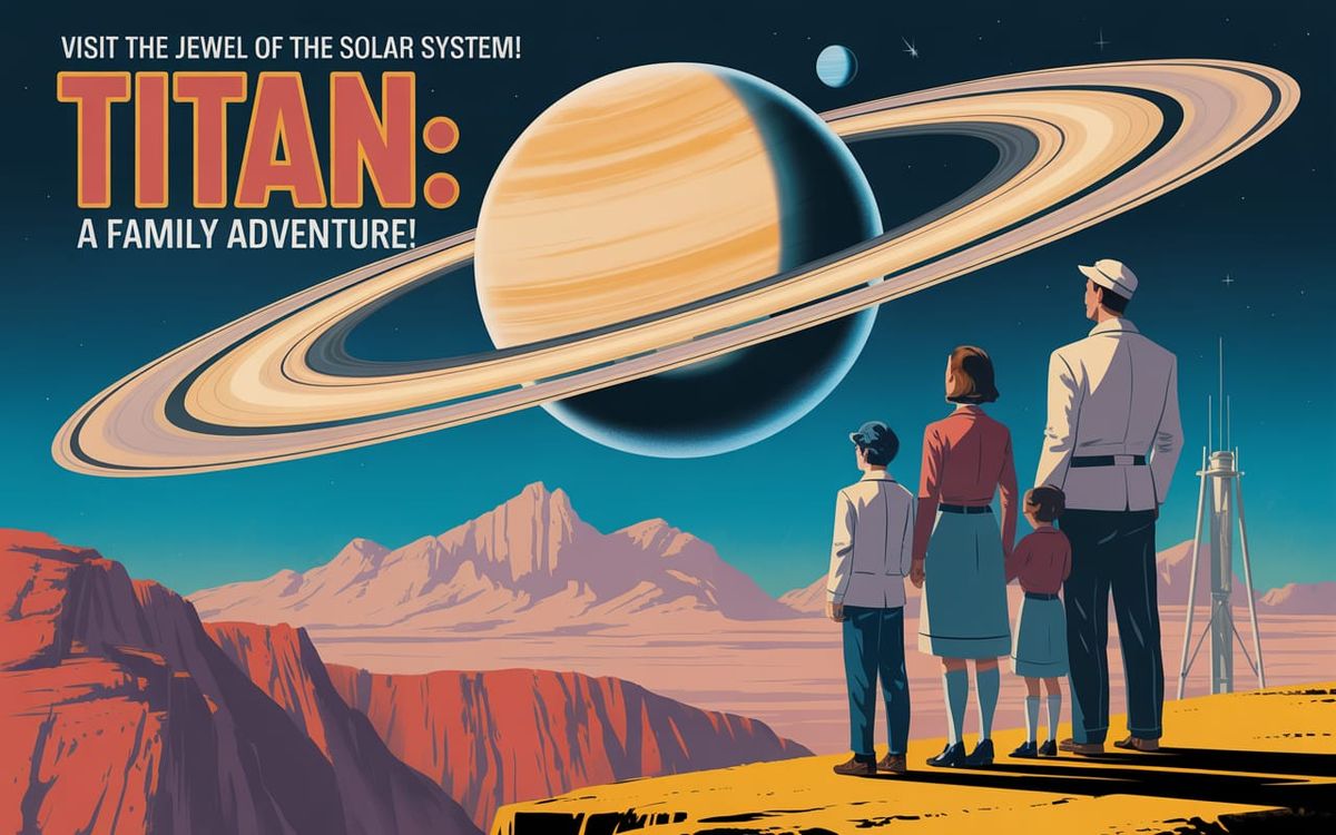 A 1950s style Travel Poster advertising a trip to Titan, a moon of Saturn. A family of four, dressed in futuristic clothing, stand in awe before a vista of Saturn and its rings in all their majesty, filling the sky from left to right! At the top of the poster are the words "Visit the jewel of the Solar ...