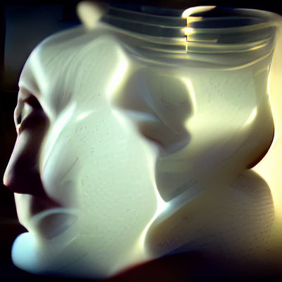 This image shows a softly lit portrait of a person seemingly made of smooth porcelain. Volumetric lighting is used to enhance the reflective quality of the porcelain.