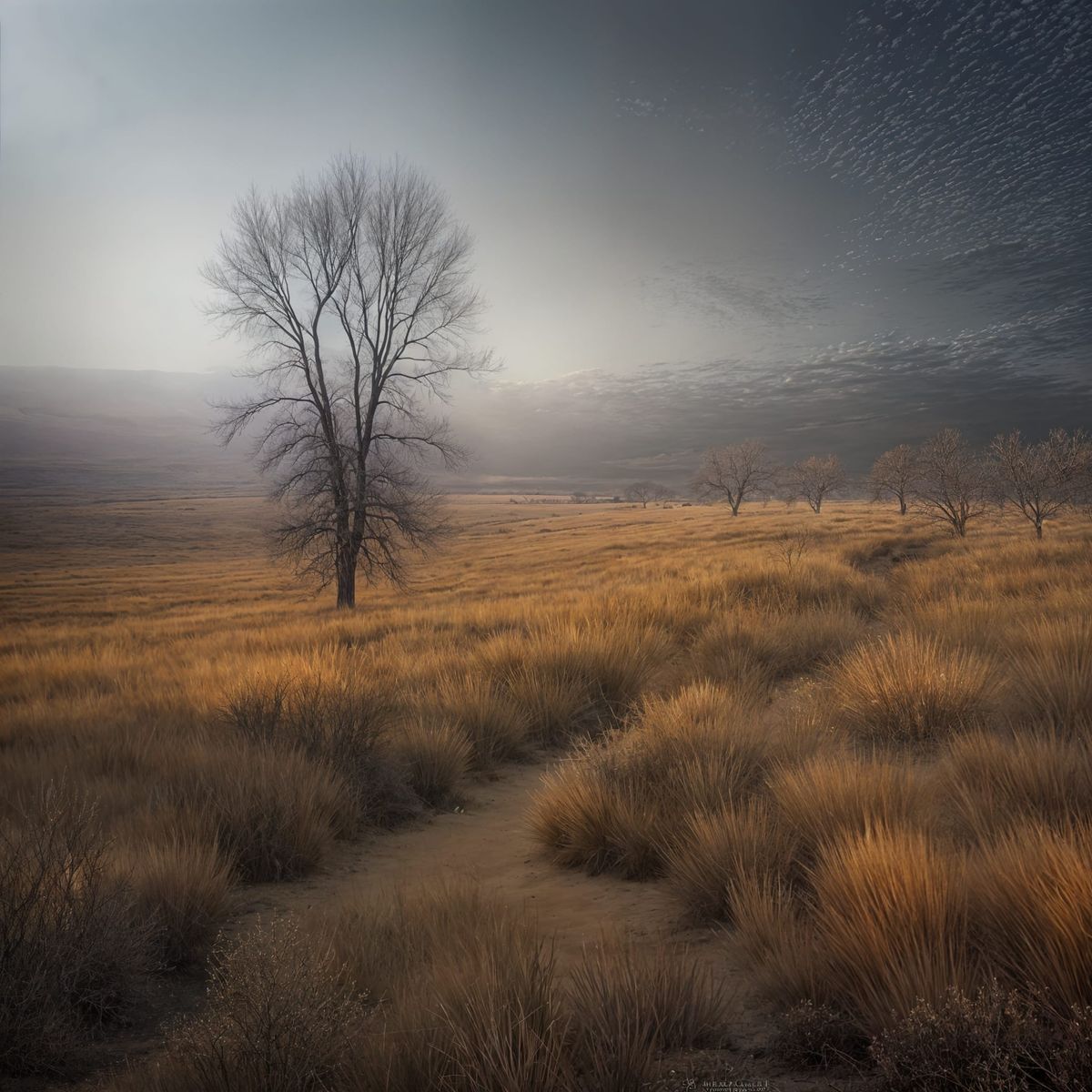 This image depicts a wide outdoor landscape with dry grass, bare trees, and a vast cloudy sky. The composition emphasizes the expansive sky with a low horizon, capturing the serene stillness of late autumn or early winter.