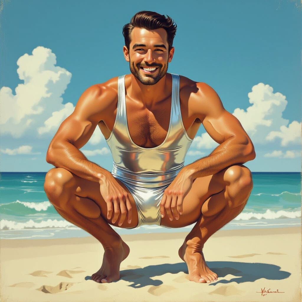 A vibrant image of a mature man in a vintage swimsuit squatting on a beach. The artwork evokes a nostalgic feel, reminiscent of mid-20th century illustration with a touch of animation.