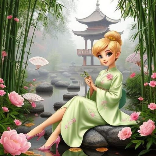 This image shows a fairy in a Japanese garden as 3D rendered digital art. She wears a satin kimono with embroidered flowers, striped heels, and holds a butterfly. Bamboo, peonies, and a pagoda complete the whimsical scene.