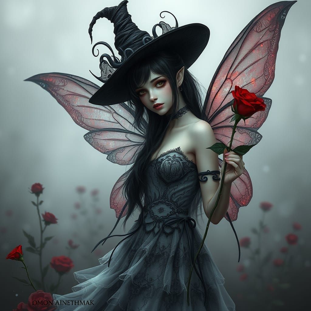 A watercolor and alcohol ink painting of a gothic fairy with black hair and glistening silver highlights. She is wearing a black gothic hat and a black holographic lace dress. The fairy has translucent holographic delicate wings and is holding a blood red rose. The background is a misty foggy landscape ...