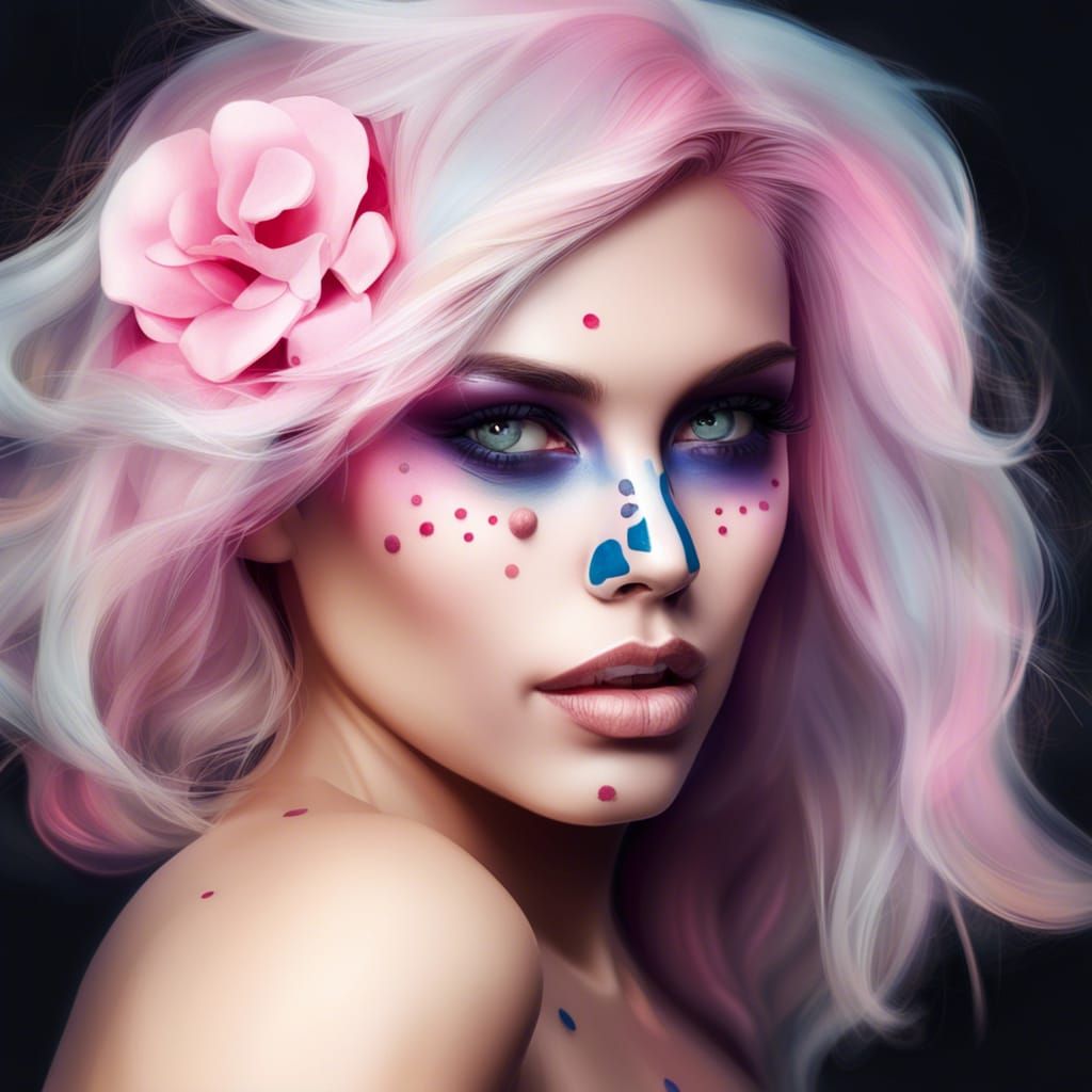 This image shows a woman in a DΓa de los Muertos themed portrait with skull makeup and pink hair. The artwork features dynamic lighting, intricate details, and a vibrant, colorful palette.