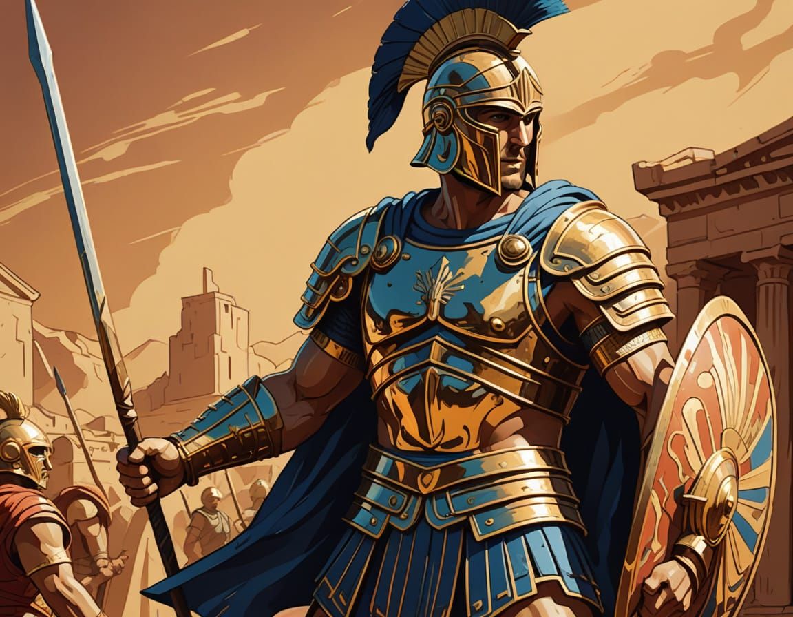 A heroic portrait of Achilles in Greek armor, set against a dramatic backdrop of earthy tones and golden accents, reminiscent of classical Greek pottery and comic book art.