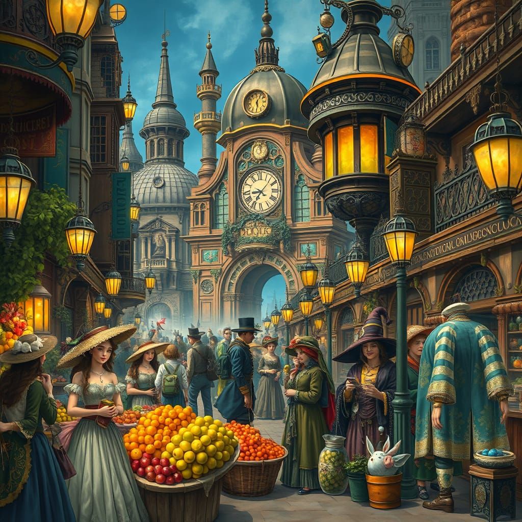 A vibrant marketplace scene filled with ornate characters haggling. The architecture blends art nouveau and steampunk aesthetics with industrial details in a painterly style. The image features rich colors and dynamic lighting.