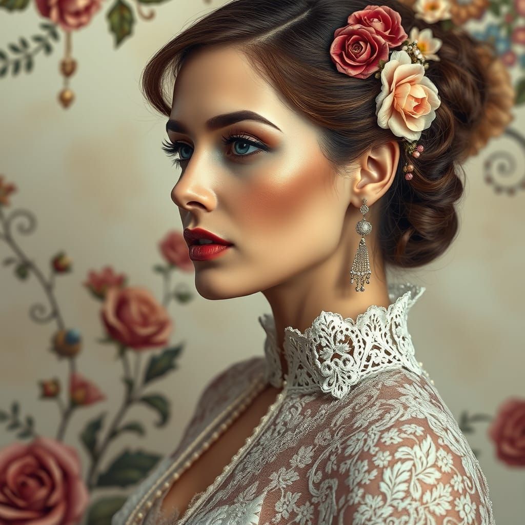 This image shows a refined woman in lace clothing, radiating elegance. The soft backdrop features flowers and ornaments, rendered with hyperrealism, dramatic details, and side lighting.