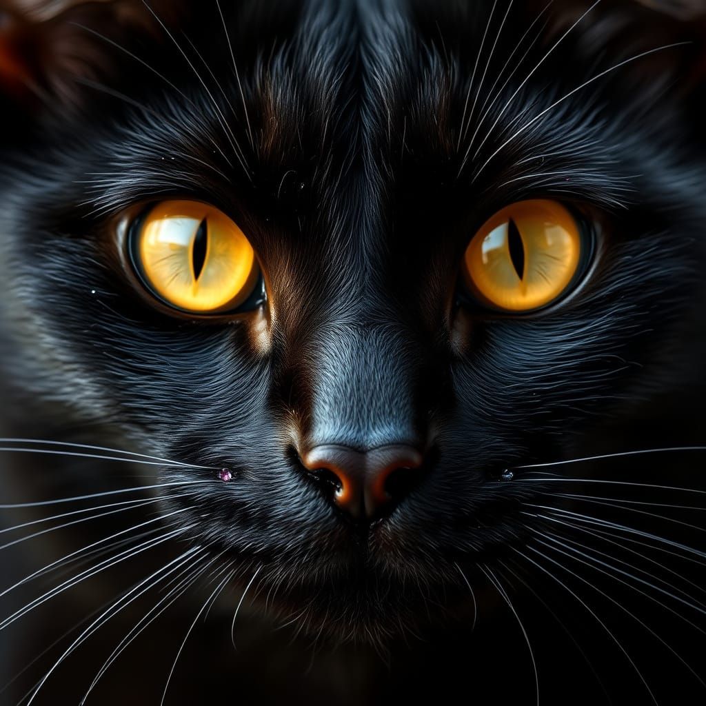 This image features a stunning, hyper-realistic portrait of a black cat with piercing gold eyes, delicate pink glitter, and intricate whiskers, creating a sense of luxurious, otherworldly detail.
