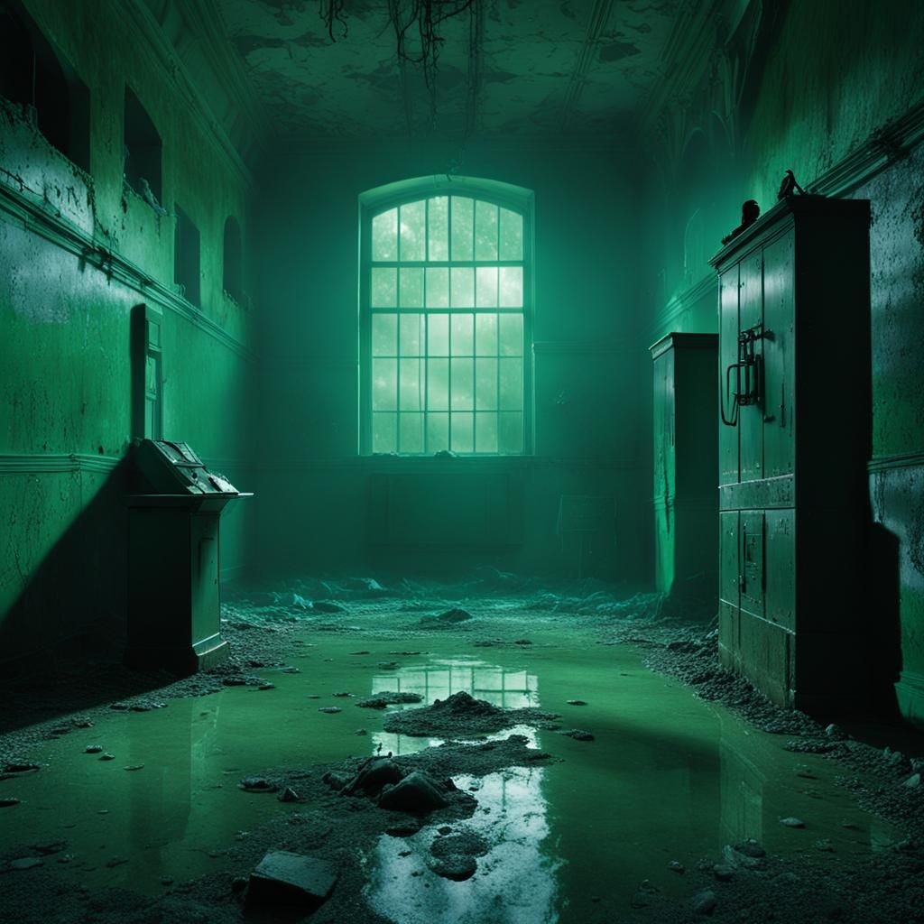 This image shows a ghostly figure in an abandoned asylum, captured with a medium shot and low angle. The scene is haunting and atmospheric, with surreal elements, using a muted color palette.