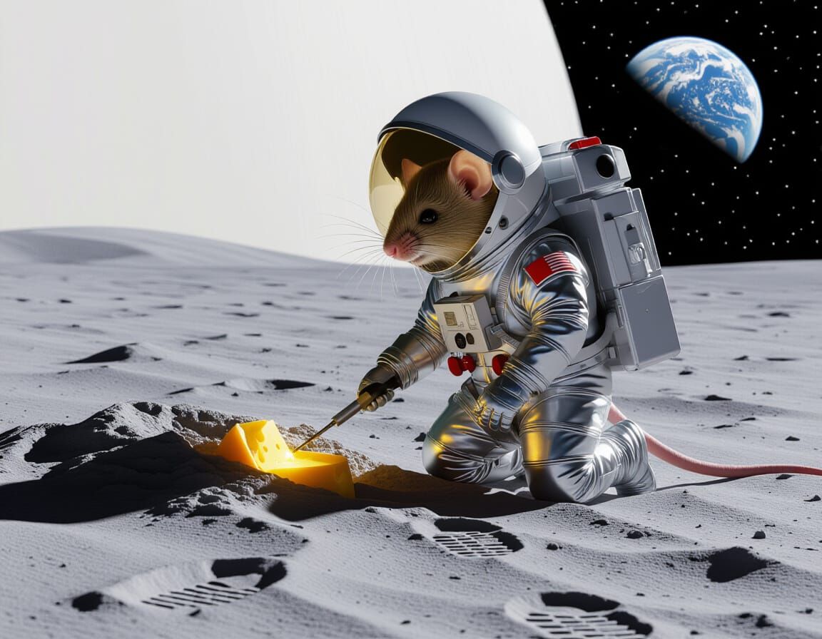 A hyperrealistic photo shows a mouse astronaut collecting lunar 'cheese' samples on the moon. Earth shines brightly in the starry sky above.