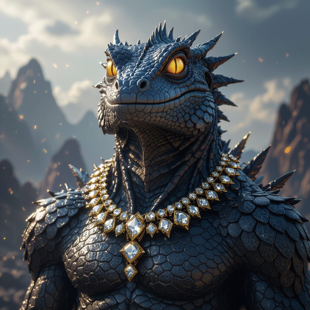 This image depicts a massive, hyper-detailed alien reptilian overlord with obsidian scales covered in glowing crypto symbols. Molten gold eyes and quantum light feathers highlight its imposing presence in dark digital skies. Photorealistic style.