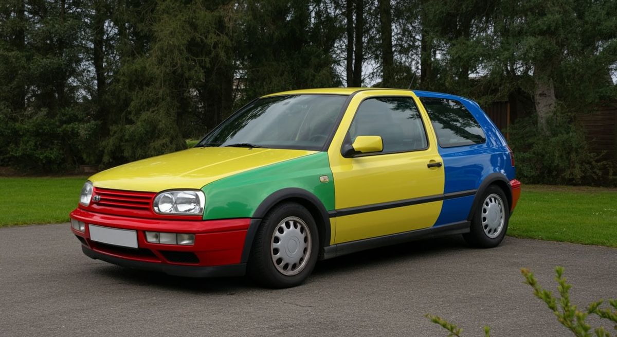 This image showcases a 1996 Volkswagen Golf Harlequin with mismatched colored panels parked in a suburban driveway. The photo evokes a nostalgic 90s European feel with clean lines and original details.