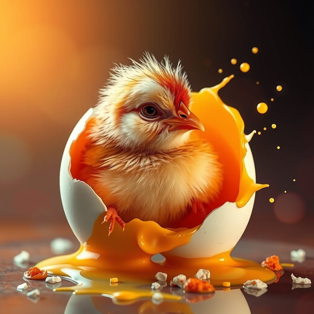 This image shows a dramatic, hyperrealistic chick bursting from a breakfast egg, with intricate feathers and beak details, against a warm, colorful background reminiscent of futuristic concept art.