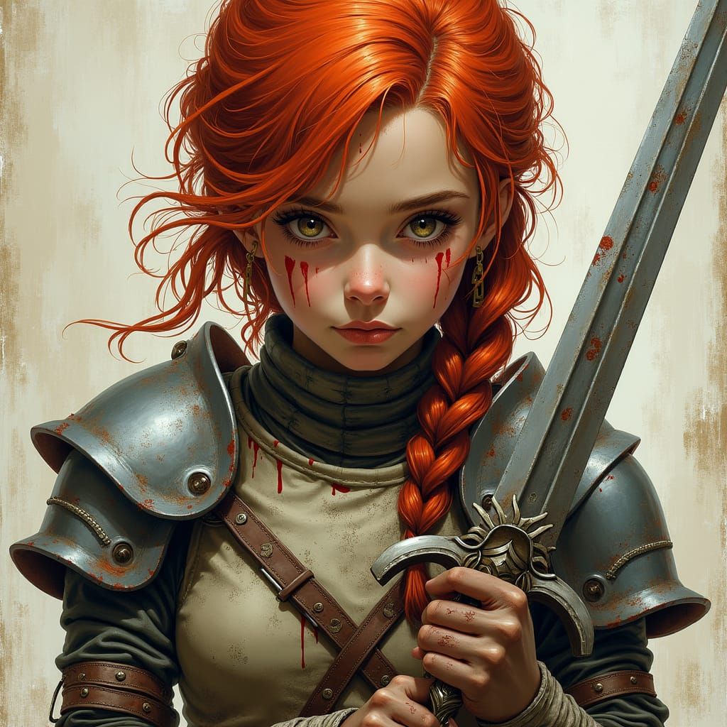 A fierce, red-haired warrior maiden with braids and blood on her face. She is clad in battle-worn armor and wields a sword in a gritty dark fantasy style.