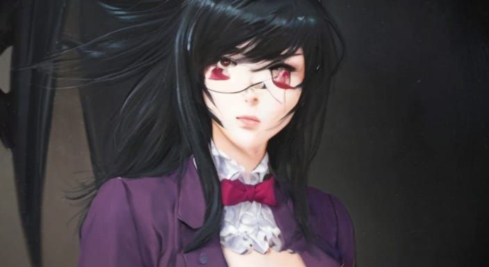 A stunning portrait of a young woman with striking red eyes and long black hair, set against a soft focus background with subtle bokeh, showcasing intricate details and fine skin texture in a warm, vibrant tone.
