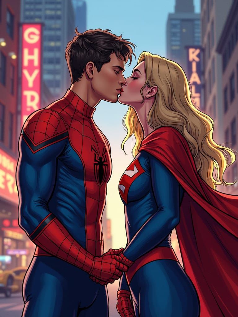 A dynamic illustration of Spider-Man and Supergirl sharing a romantic kiss against the vibrant backdrop of New York City, featuring bold lines, vivid colors, and a sense of energy and movement, reminiscent of comic book art