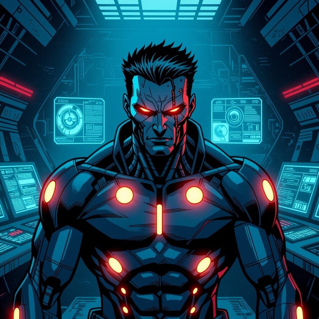 A close-up of a cybernetic villain in a high-tech lair. The half-human, half-machine character is depicted with glowing implants and a menacing expression in a gritty comic book style.