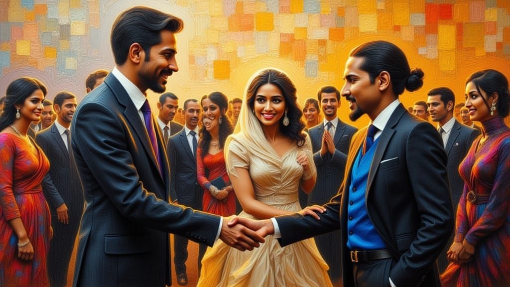 This image captures a formal meeting with abstracted figures in a vibrant impasto style. Thick brushstrokes and dramatic lighting create emotional intensity and dynamic tension.