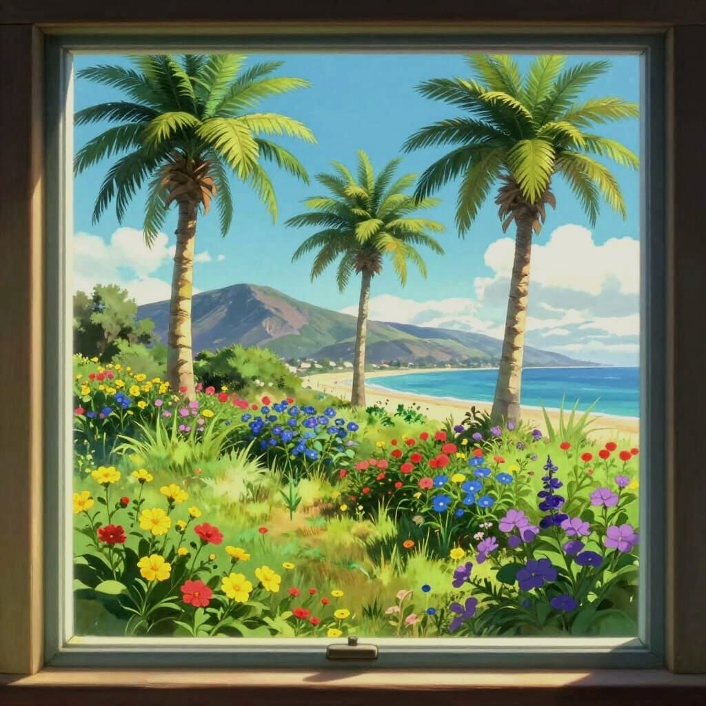 This image shows a sun-drenched garden viewed through a window, featuring diverse palm trees and colorful flowers. Majestic mountains and a serene seashore complete the idyllic scene, rendered with vibrant colors and gentle lighting.