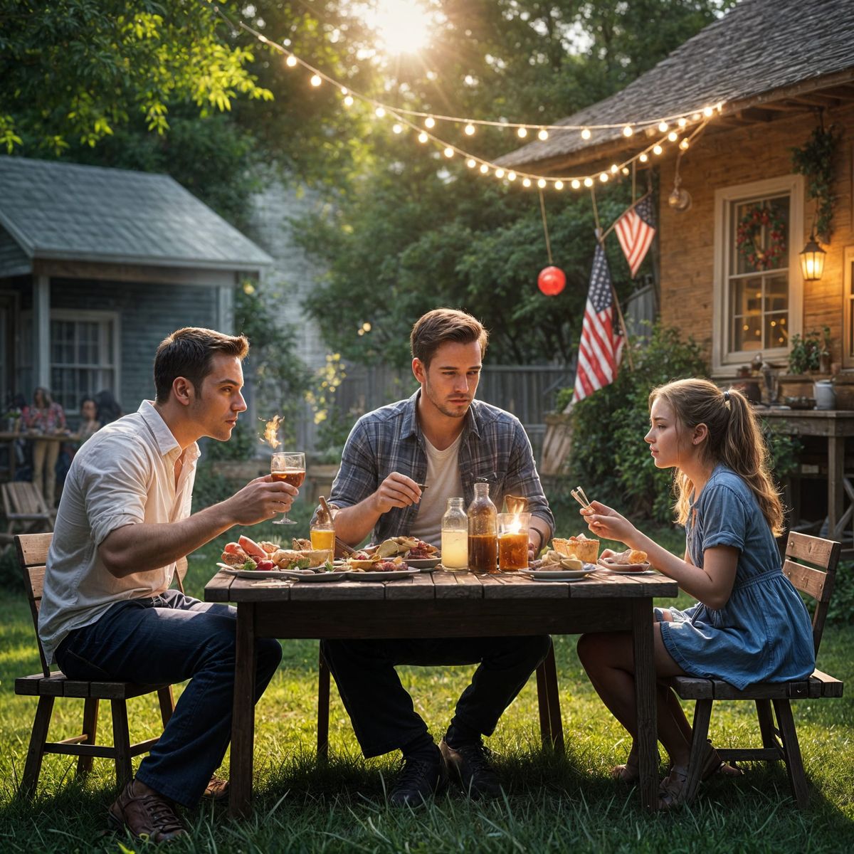 This image shows two fathers and their daughters enjoying a Fourth of July picnic in their backyard. One father is grilling while the other plays with the children amidst festive decorations.