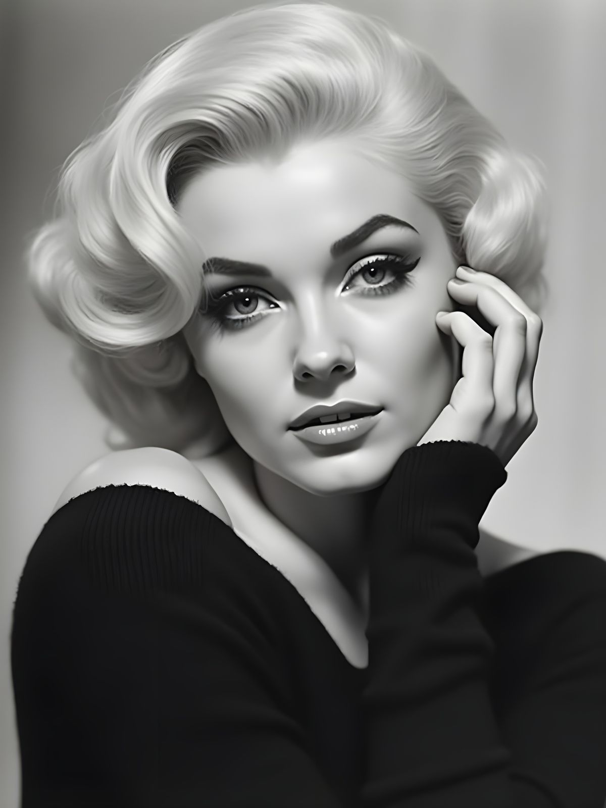 A striking black and white portrait of a woman with platinum blonde hair styled in soft waves. The image evokes a classic Hollywood glamour aesthetic with soft lighting and a shallow depth of field.