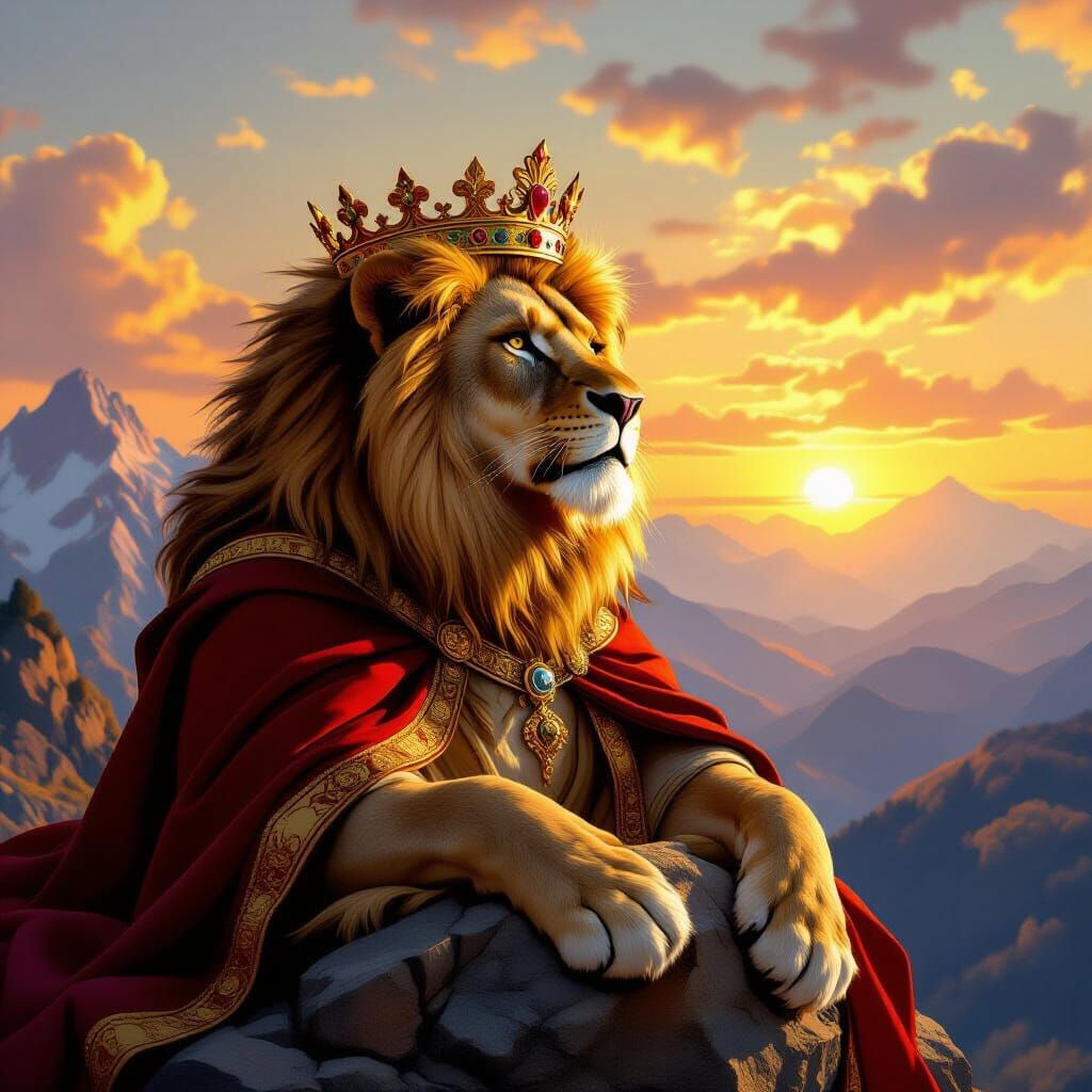 A majestic lion wearing royal garments gazes over his realm from a high mountain. The digital artwork exhibits soft lighting and a painterly style reminiscent of Baroque art.