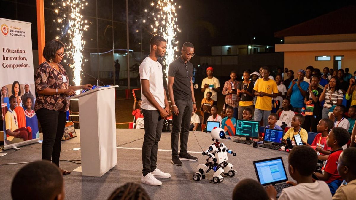 This image captures a grand, festive ceremony for the Adams Family Foundation's anniversary, featuring a robotics and coding demonstration with dignitaries and beneficiaries. The scene blends solemnity with lively celebration, highlighting hope and intergenerational collaboration.
