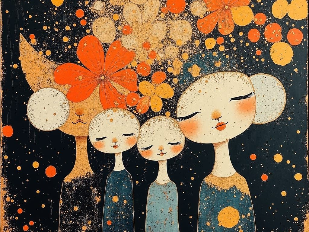This image shows a family photo with five figures set against a backdrop of fireworks and cherry blossoms. The artwork employs cubist and expressionist techniques, with bold colors and layered textures, in a chaotic, magnetic composition.
