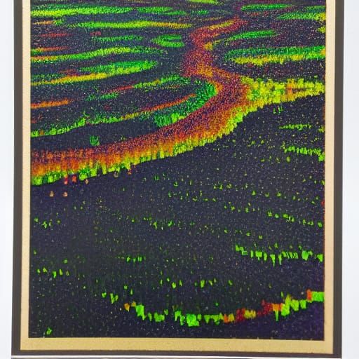 heavy photogravure base, layered with holographic-foil overprints: The viewpoint hovers just below immense, Seurat-inspired older woman—each braid of hair a pixel of searing neon green, veins pulsing with glitching gold, trailing particle-system embers into shadow.