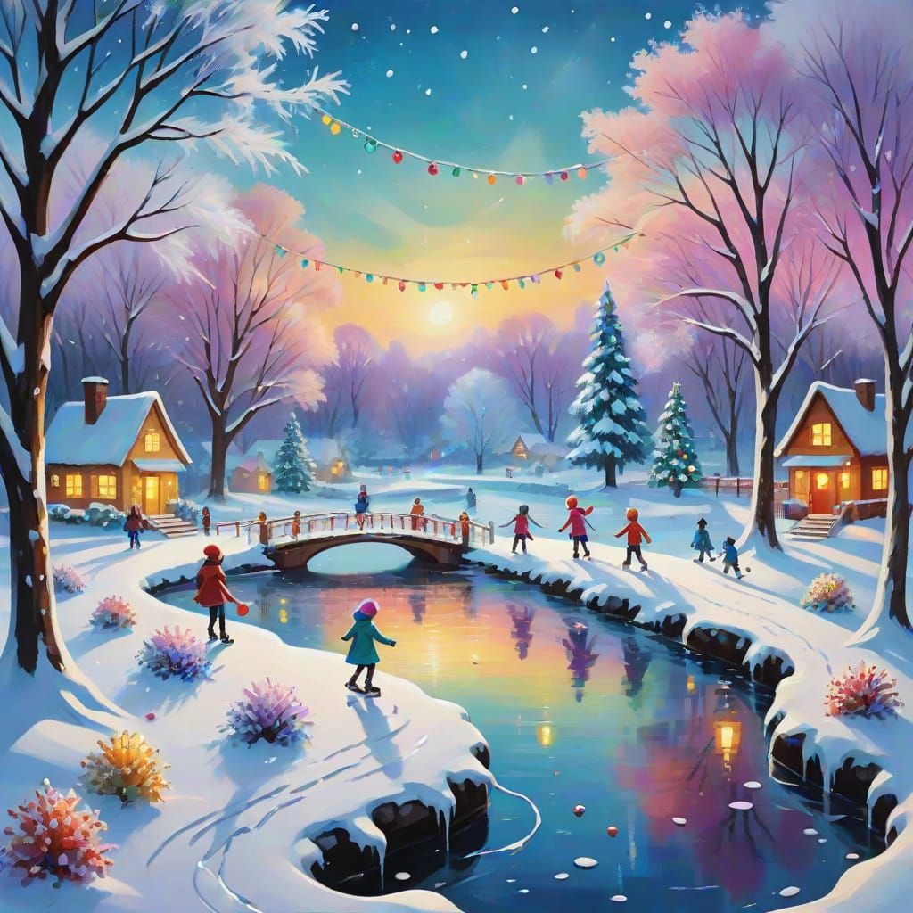 A vibrant oil painting of a winter wonderland scene with children ice-skating on a frozen pond surrounded by snow-covered trees and colorful New Year's decorations, set in a soft focus with warm golden hour lighting and twinkling lights reflecting off the ice.
