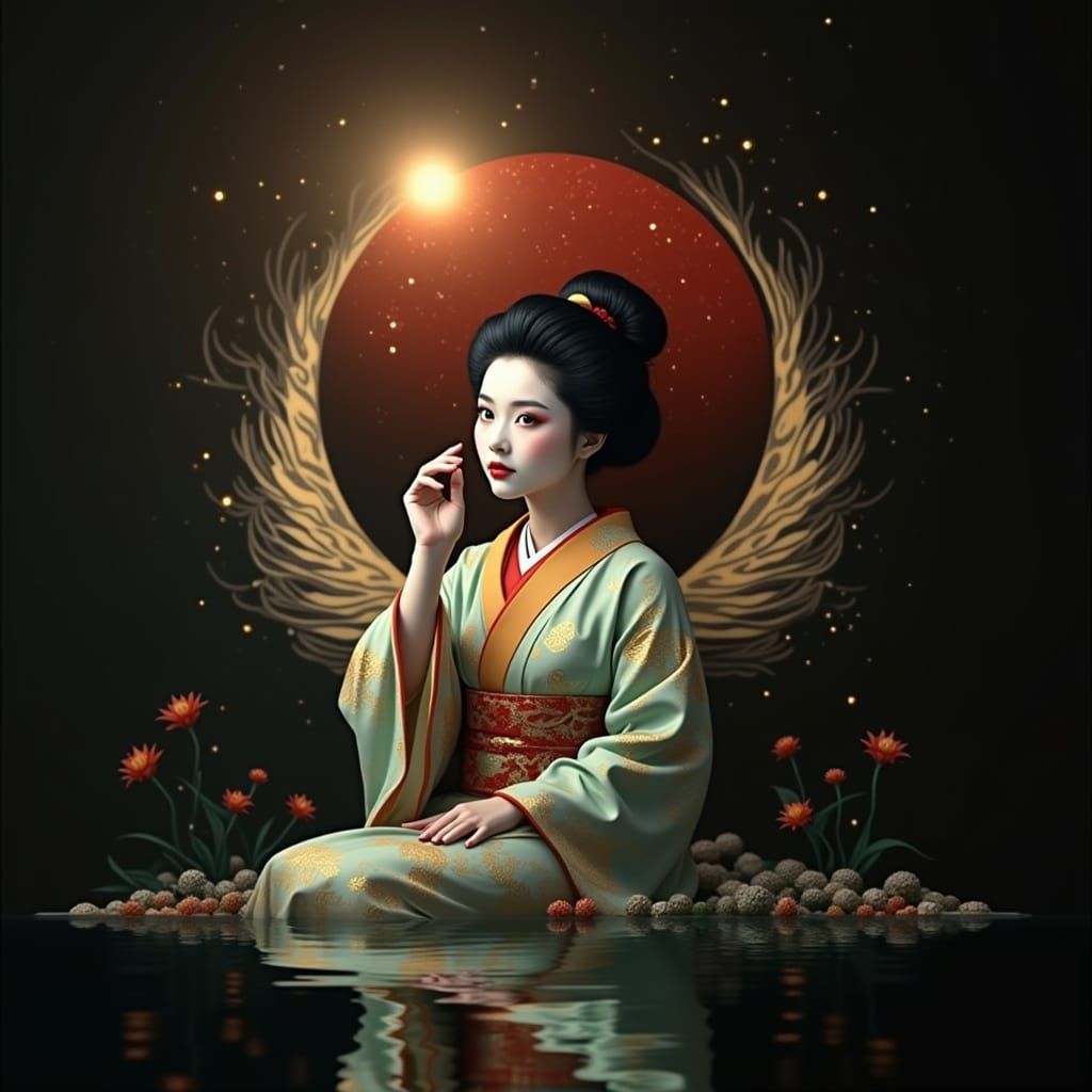 A striking portrait of a geisha with dark hair and green eyes, reflected in a mirror. She wears an elaborate dress with golden motifs, set against a cosmic backdrop, as hyperdetailed digital art.