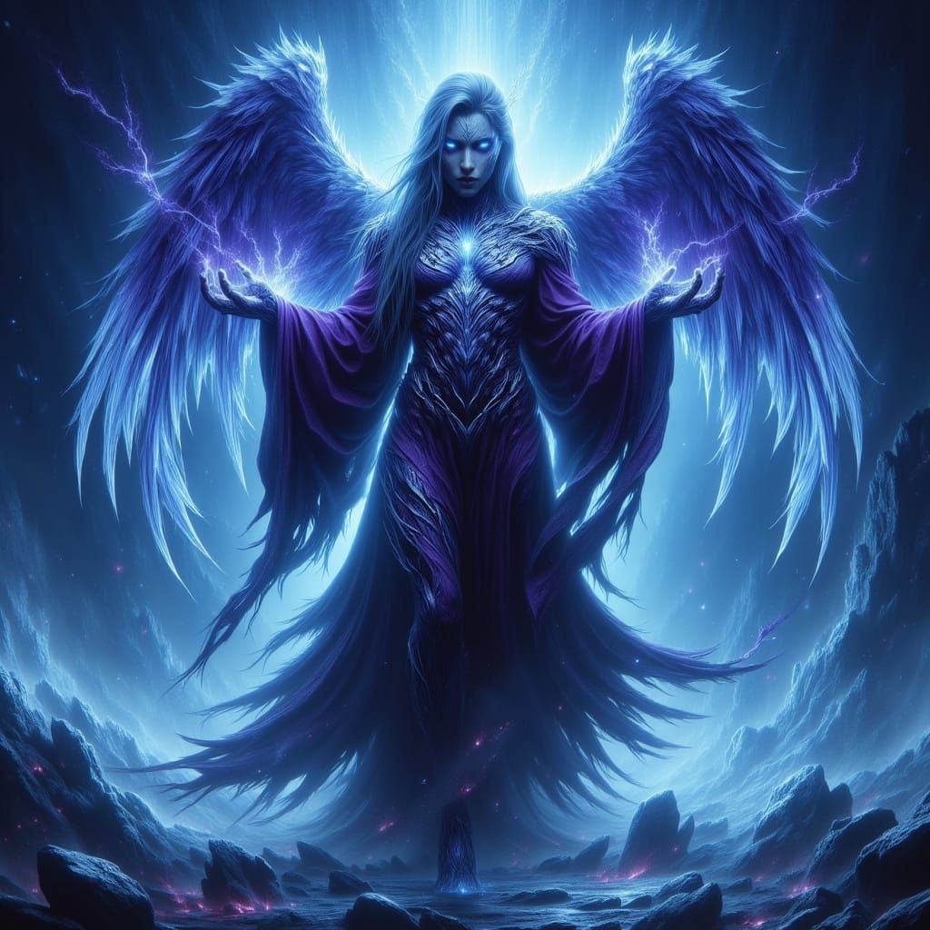 A mystical water shaman with glowing white eyes and ethereal wings conjures swirling water. Rendered in a dramatic fantasy concept art style with cool colors and intense lighting.