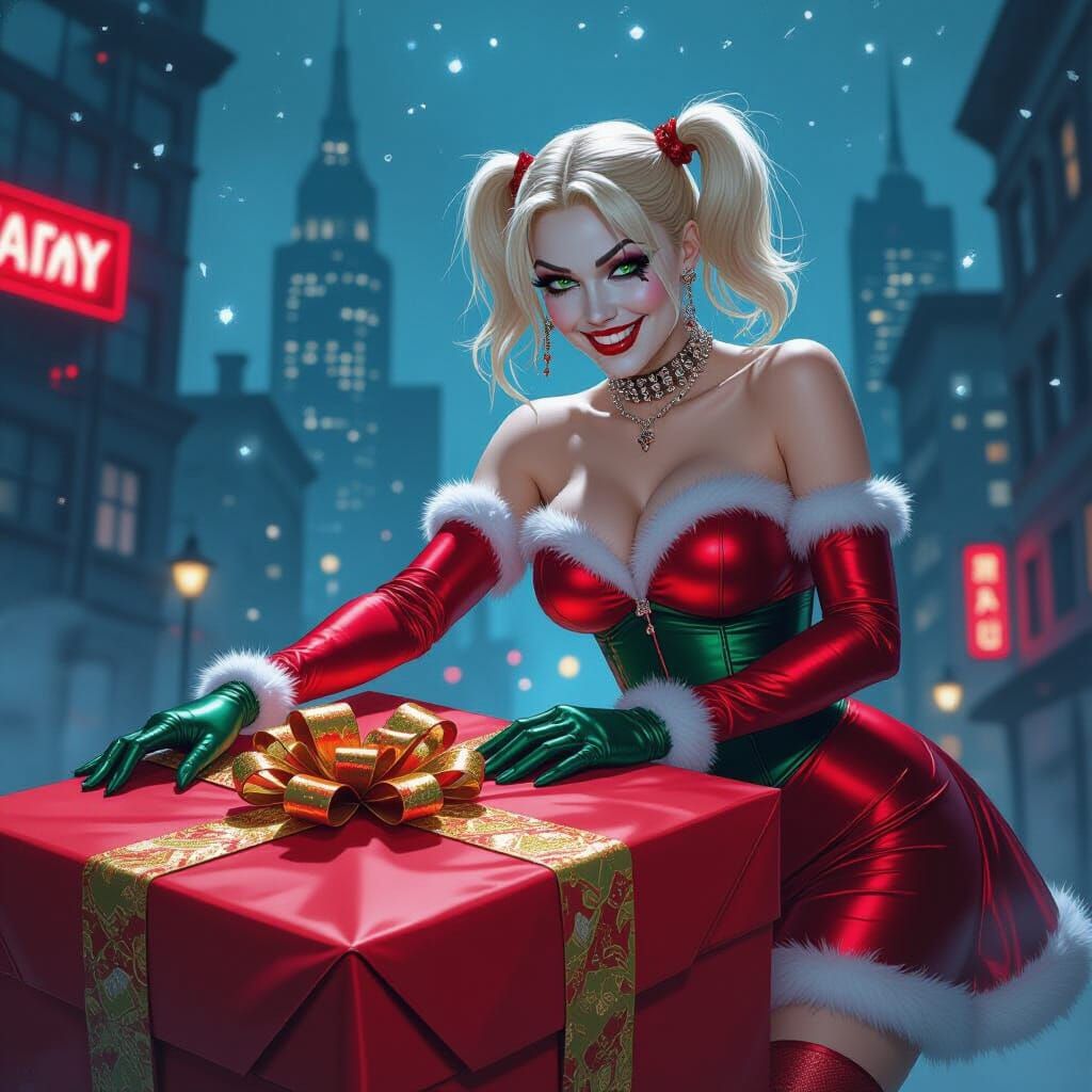 A vibrant image of Harley Quinn in a festive Christmas dress, playfully posing with an oversized gift against a stylized Gotham backdrop. The artwork combines comic aesthetics with hyperrealistic rendering and cinematic lighting.