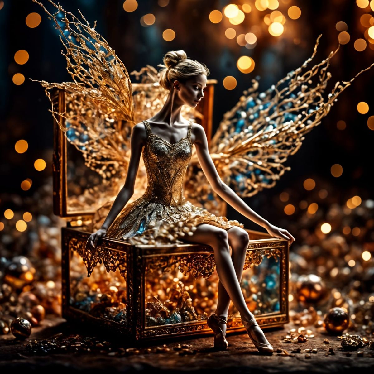 This image shows a ballerina's transformation. Starting as a figurine in a jewelry box, she becomes a living dancer, stepping out of her pointe shoes and flying away.