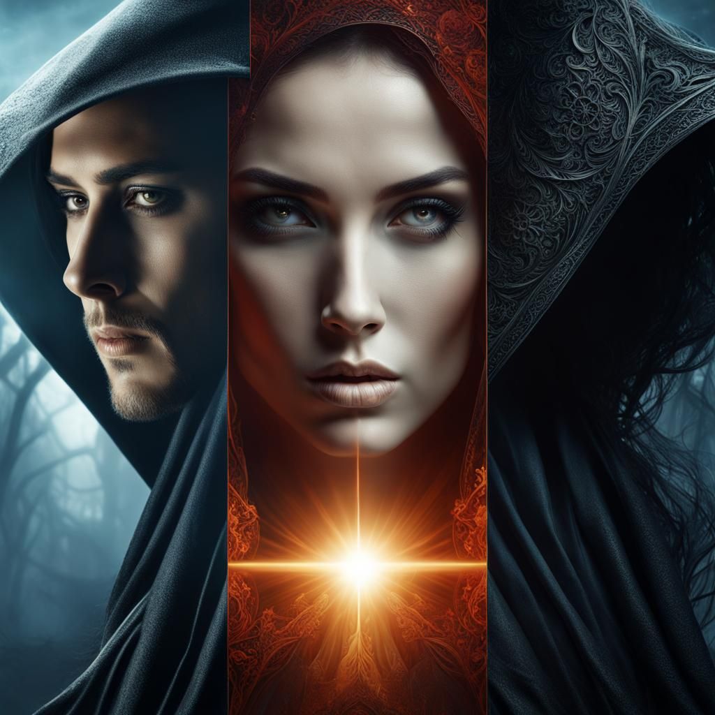 This image shows a split screen with a beautiful woman and a grim reaper, representing lost love. The image features double exposure, intricate details, and high-quality CGI effects.