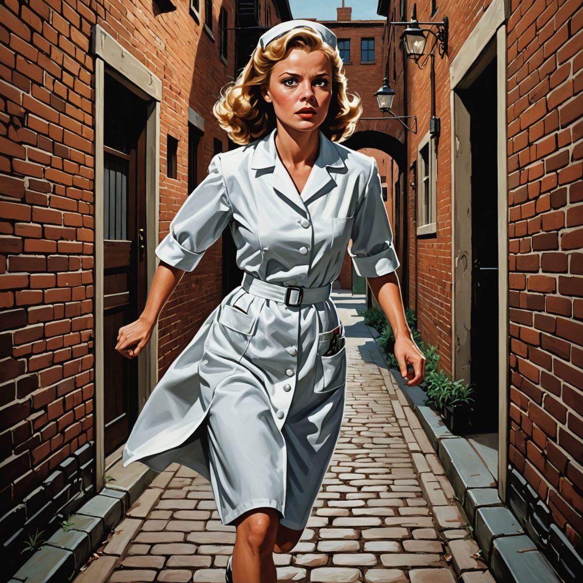 A striking picture of a terrified nurse fleeing down a dark alley. The artwork evokes mid-20th century pulp fiction, rendered with hyperdetailed brushstrokes and dramatic chiaroscuro lighting in an oil painting.