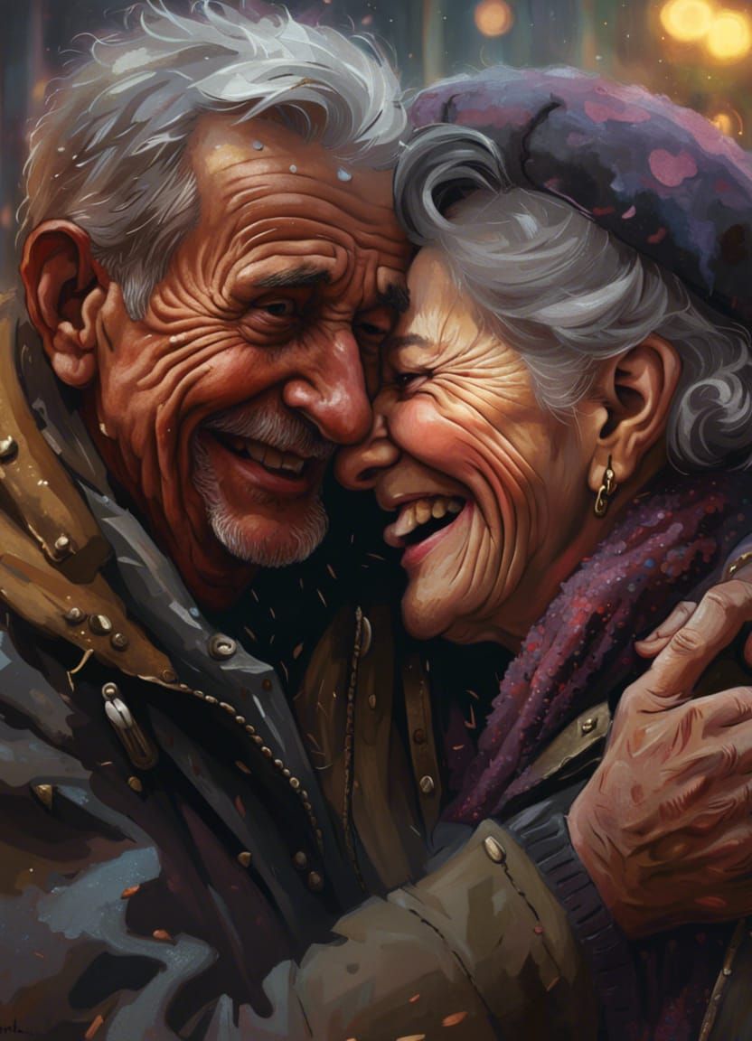 This image shows an elderly couple embracing and sharing a joyful laugh. The portrait is rendered with hyperdetailed brushwork and intricate composition, reminiscent of fantasy concept art.