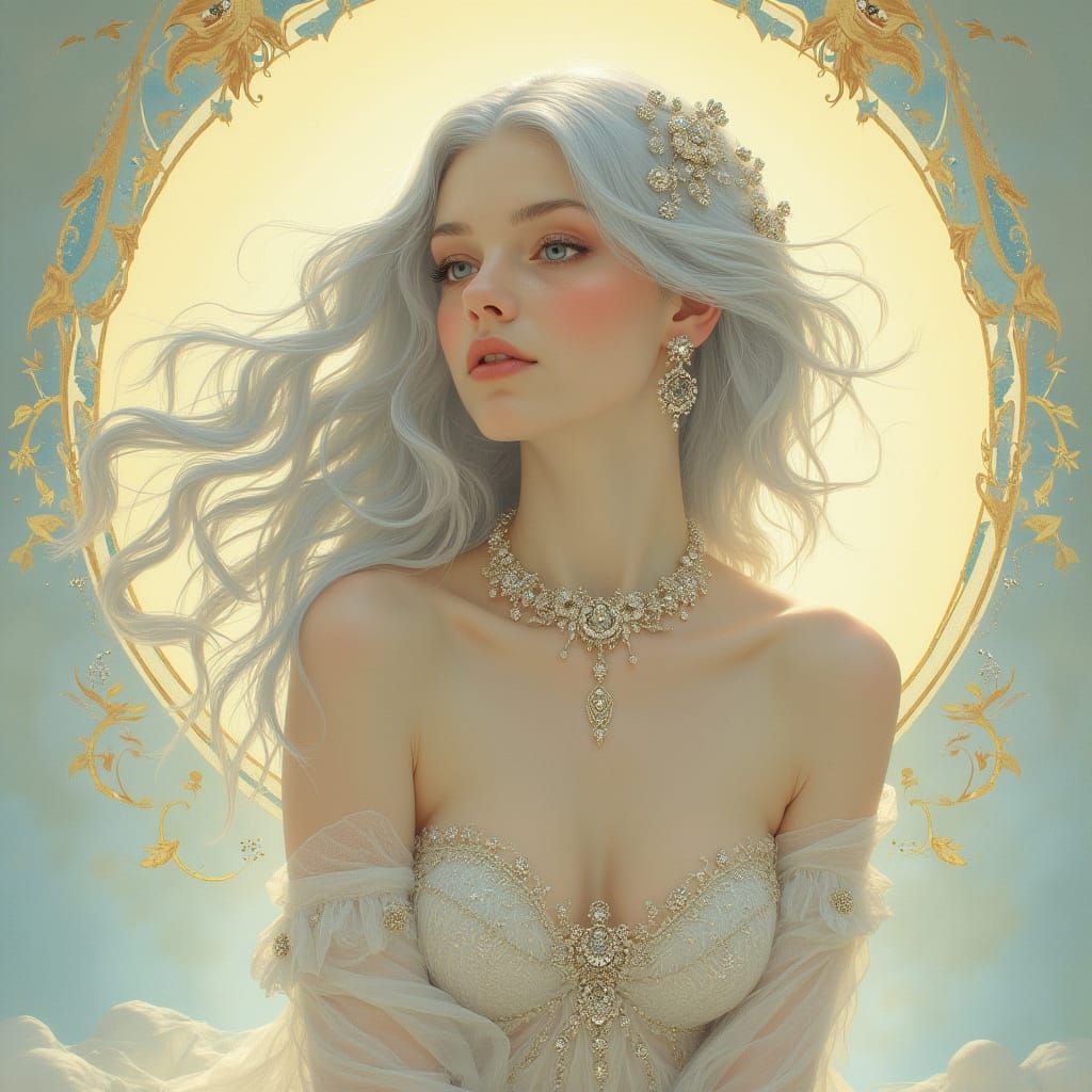 A captivating image of a goddess with silver hair and jeweled clothing, presented in an Art Nouveau style. The soft pastel background and ethereal lighting enhance the dreamy atmosphere.